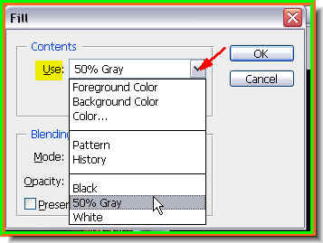 Step 14 : Press SHIFT+F5 and the Fill dialogue box comes up. From the dropdown change the Use to 50% Gray. Click ok.