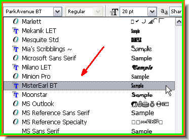 Step 35 : Now choose a font from the drop down box. In PS7 the names of the fonts are given, but you cannot make out how they look. ThE CS 2 and CS 3 has the advantage that you can make out how they look like.