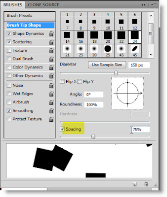 Step 24 : Bring up the Brush dialogue by clicking on the icon on the right of the top panel. Increase the Spacing to 75%. Make the size of the Brush smaller by pressing the [ (left bracket key).
