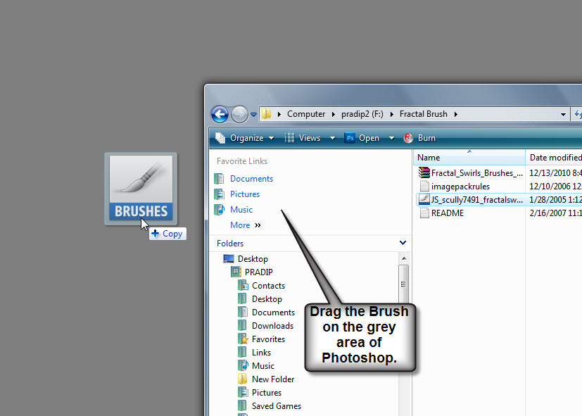 Drag the Brush from the folder to the grey area of photoshop. No image should be open. When you drag a +Copy appears below the Brush.
